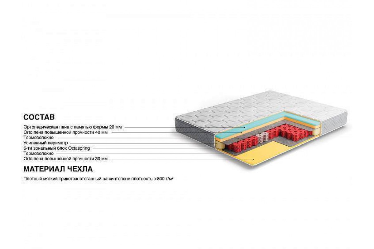 Пена мемори с угольной пропиткой 2 см / Пена средней жесткости 4 см / Термоволокно / Блок пружин Octaspring 5 зон / Термоволокно / Пена средней жесткости 3 см / Усиленный периметр