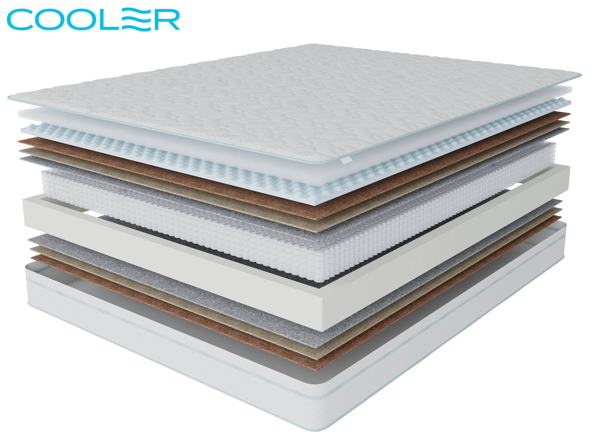 Пена упругая 2 см / Латексированный кокосовый лист 2 см / Термоволокно / БНП 500 пр, м2 / Термоволокно / Латексированный кокосовый лист 3 см/ Особо мягкая пена с ячеистой структурой 2,5 см/ Усиление периметра